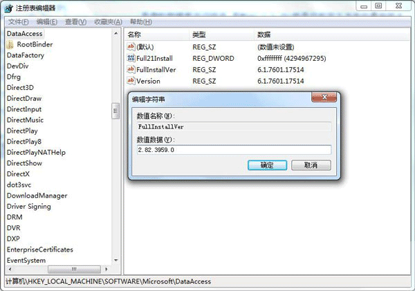 3.修改这两个文件数据数值,"FullInstallVer"="2.82.3959.0","Version"="2.82.3959.0",并重新检查一下安装环境即可。
