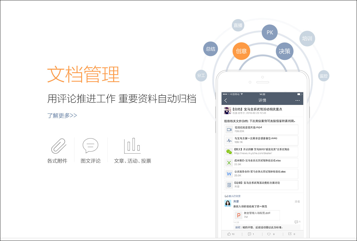 -图文评论:群组成员随时随地评论,讨论有痕迹,评论也可插入附件,工作有结果