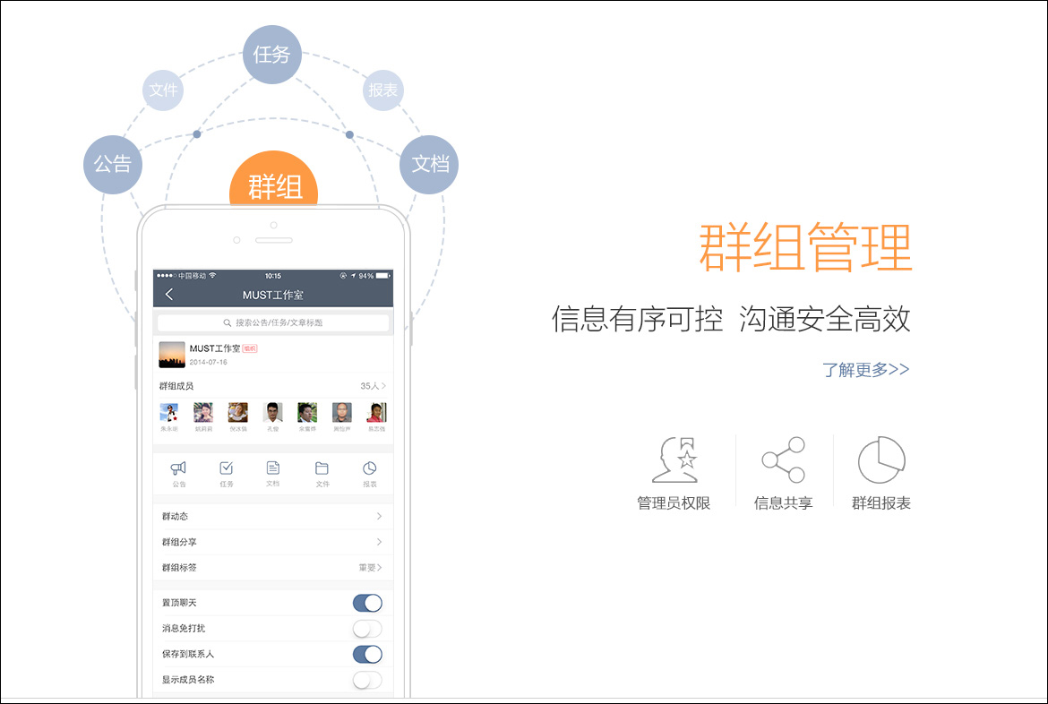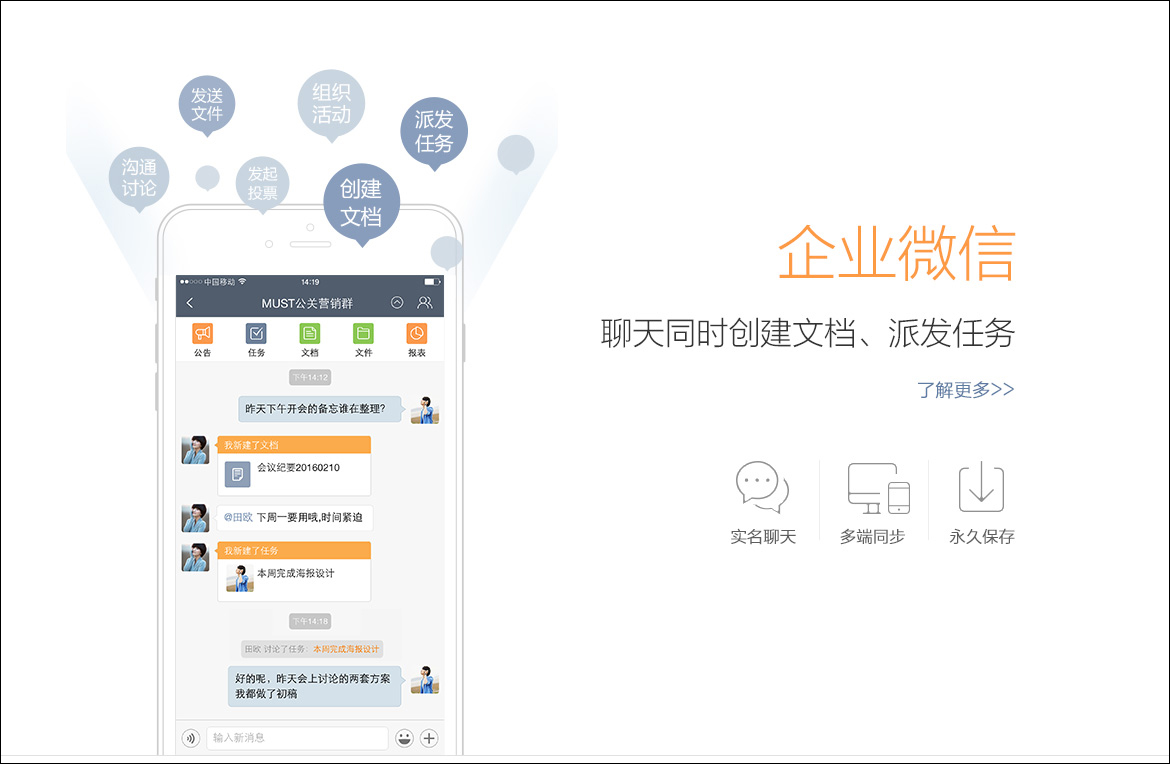 4、立体沟通,不仅是聊天:这里聊的都是工作,绝不跑题;聊天同时发起公告、投票、活动,立体沟通,快速响应。
