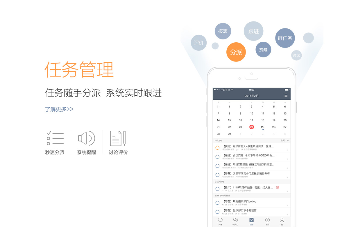 1、任务协同,够开放才管用:任务随想随建,过程可讨论,完成可评价;员工全程可随时加入;任务、文章、知识、群组均可推荐分享。