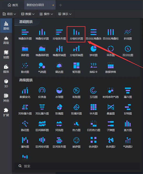 新建大屏项目在导入数据后,选择任意一个组件,如下图所示: