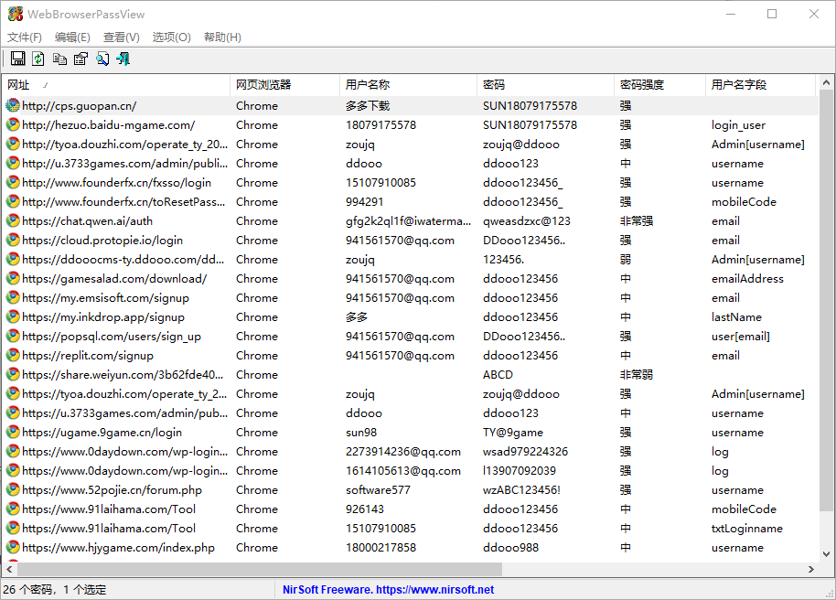现在的Web浏览器为了方便用户登录,都内置了“记住密码”的功能。有了这个功能以后用户不必记住他们的账号密码,浏览器会自动填充这些信息。当你过于依赖这种功能以后,在别的地方需要登录其中一个网站的时候,却发现自己忘记了登录密码。这个时候 WebBrowserPassView 就可以来救你了!它可以轻松在短短几秒之内把你浏览器 (IE、Firefox、Chrome及Opera) 里面保存的密码统统挖出来。