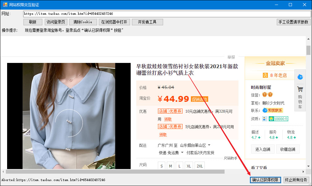 点软件操作区的开始按钮,程序就自动工作了。很多网站比如阿里系有严格的防采集设置,需要登录账号或者通过人机验证才能继续访问,所以点击开始后会弹出一个网页对话框。