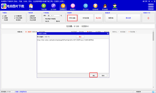 3、单击导入链接,将你想要下载的平台商品地址链接复制到方框中,然后确定;