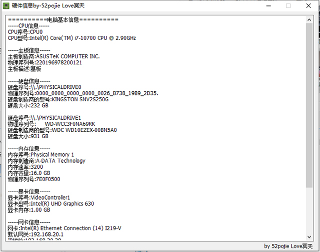 电脑硬件检测器是一款简单实用、绿色小巧的pc电脑硬件检测工具,能够轻松的检测出电脑中的所有硬件信息,包括硬盘信息,内存信息,显卡信息,网卡信息,操作系统信息,并且详细的显示各个硬件的型号,制造商,序列号等,是你硬件检测的好帮手。最主要的是,这款软件体积小巧,无需安装,打开便能够直接查看到自己电脑的基本信息,使用起来非常的方便,欢迎有需要的朋友前来下载体验!!!