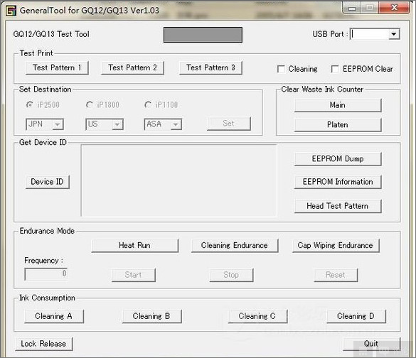2、然后打开佳能ip1880清零软件(版本为:GerneralTool for GQ12/GQ13 Ver1.03 注意与IP1600的清零软件不相同),此时软件会自动侦测到打印机。(大家注意,打印机IP2580对应的是IP2500,IP1880对应的是IP1800,IP1180对应的是IP1100。)