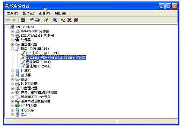 2、计算机重新启动后插入usb数据线,在控制面板的“系统”属性中的设备管理器的“端口”中可以看到USB转COM 的端口号。(如下图例的COM3)