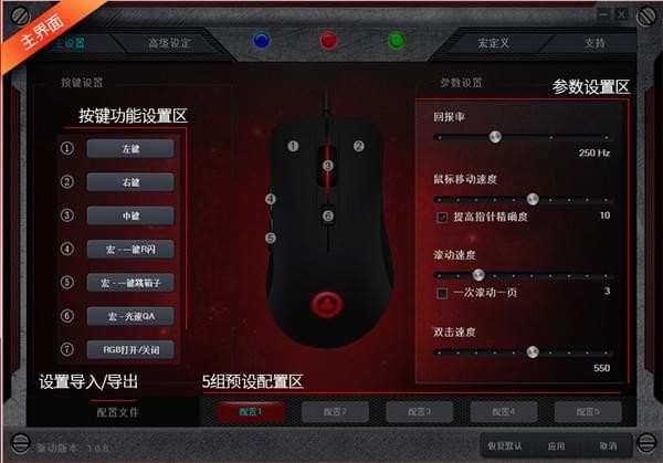 1、主设置:按键功能设置以及回报率、指针移动速度、滚轮速度、双击速度等参数设置