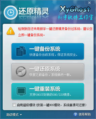 新宇一键备份还原精灵是一款傻瓜式的一键备份还原系统软件,具备一键备份系统、一键还原系统、一键重装系统三大功能,能够帮助用户轻松恢复到电脑最佳系统状态,彻底解决系统运行慢、卡机、感染病毒等问题,适用于电脑新手、装机人员使用。同时新宇还原精灵具备安全、快速、保密性强、压缩率高、兼容性好等特色,能够兼容Win2003、Winxp、Win7以及WinPE系统,是用户备份还原系统的好帮手。