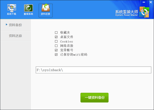 5、然后,在资料还原界面大家可以通过收藏夹、桌面文件、cookie、网络连接、宽带账号、已保存的WiFi密码进行一键资料备份;