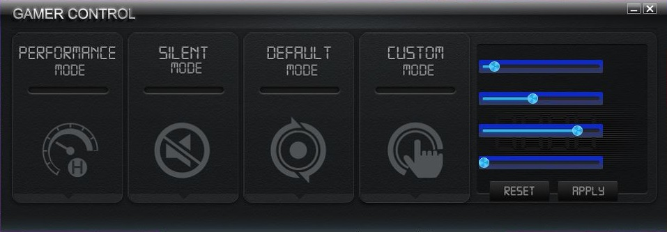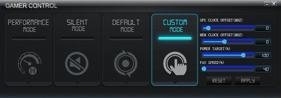 第四个选项叫做自定义模式,你将可以自定义设置显卡的参数了,这也就是超频了,这个模式只建议老司机使用,新手就老老实实的用前面三个吧,那我们看到那边的四个可以拉的条都是英文的,它们分别是核心频率、显存频率、tdp限制、风扇转数。当点击APPLY为应用当前设定,RESET为重置当前设定。
