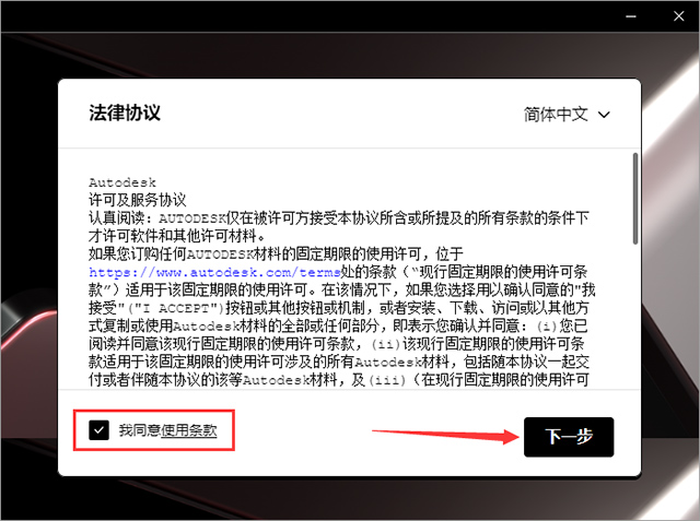 3、软件安装许可协议同意,勾选【我同意使用条款】