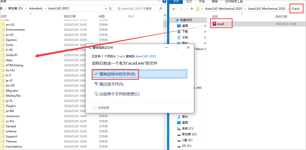 8、接下来对软件进行激活,打开Crack文件夹,将里面的补丁文件acad.exe复制到软件安装目录位置下替换即可激活;