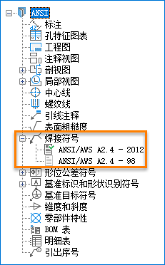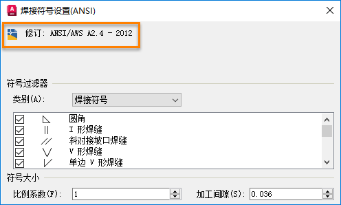“焊接设置”对话框显示了最新的 ANSI 修订。“符号”过滤器中还列出了对应的焊接和打底符号。