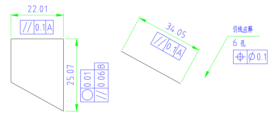 您可以创建与尺寸标注、孔注释、螺纹注释和引线中的文字关联的形位公差符号。系统还会根据国际绘图标准来确定形位公差符号的位置。