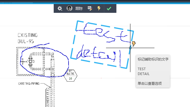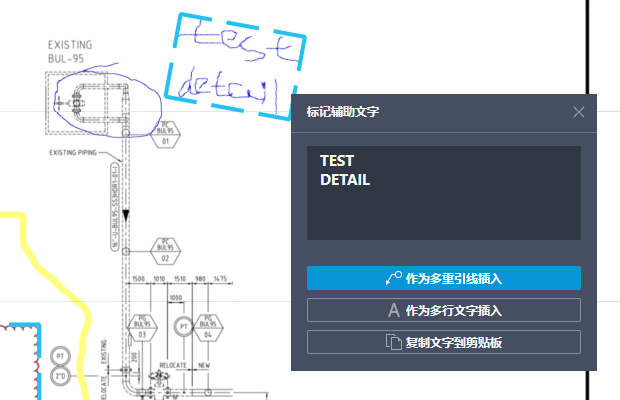 “标记辅助”功能会自动将标记识别为文字、引线和修订云线。单击识别的标记,然后将其作为多行文字、多重引线或修订云线对象插入。可以在插入文字之前对其进行编辑,也可以选择将文字复制到剪贴板。