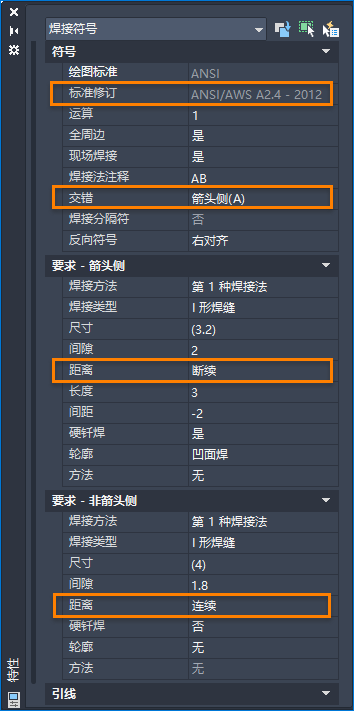 可以在“特性”选项板中查看和修改所有焊接符号特性。