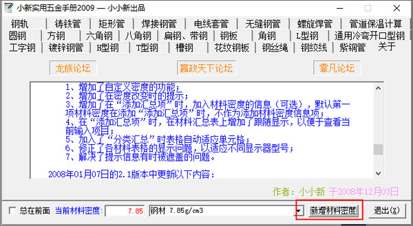 注意:您添加或修改了材料密度之后,需要重新运行本程序才可以更新您所添加或修改的材料密度信息!