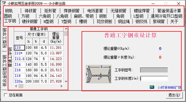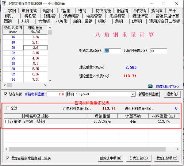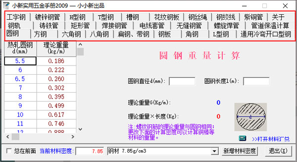 2、支持20多种钢材计算,显示全部型号的钢材数据。