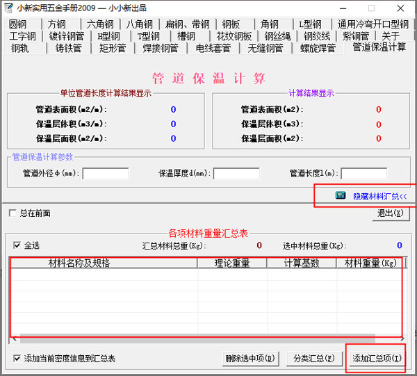 4、你还能打开材料汇总功能,同样还是点击右下方显示的“打开材料汇总”,在这里你可以添加汇总项、删除选中项等操作。