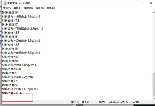 3、你还可以添加材料密度,点击右下方的“新增材料密度”功能,这时页面会弹出一个配置文件。那么如何增加材料密度,首先请按照材料密度的顺序及格式添加材料密度,默认第一项的材料密度不作为添加密度信息项。