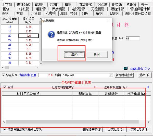 6、修正“圆钢”、“方钢”、“六角钢”、“八角钢”在选用其他材料密度后,单击材料表格时,其理论重量仍然为表中所示理论重量的Bug;