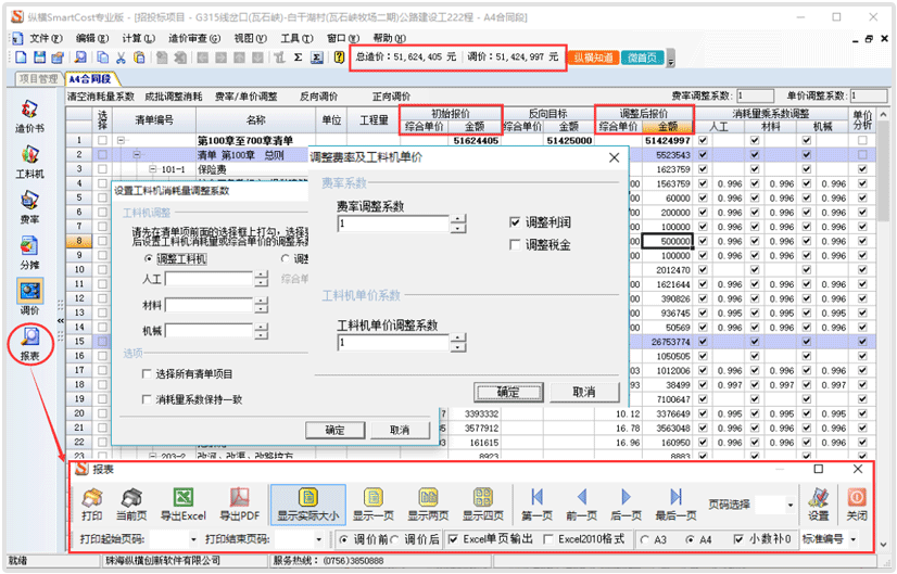 3.调价功能,是顶尖造价工程师的至爱。同时具备正向和反向调价功能,同时出调价前后两套报表;深入至消耗量、单价、费率的每一个细节,立即实现任意单价调整。