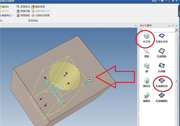 2、为了节省时间,直接从设计元素库中拖一个长方体和一个孔类圆柱体,然后手动修改一下孔的尺寸。