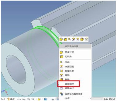 现在实体设计中有一个“删除表面”功能,用户选择“删除表面”特征,激活属性面板然后旋转要删除的面,点“确认”完成操作。对于需要做大量删除面的零件这个操作过程过于复杂,在2021版本中选中面以后右键菜单增加了“直接删除”选项,可以在不弹出属性面板的情况下直接删除选中的面,简化了操作步骤。