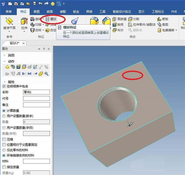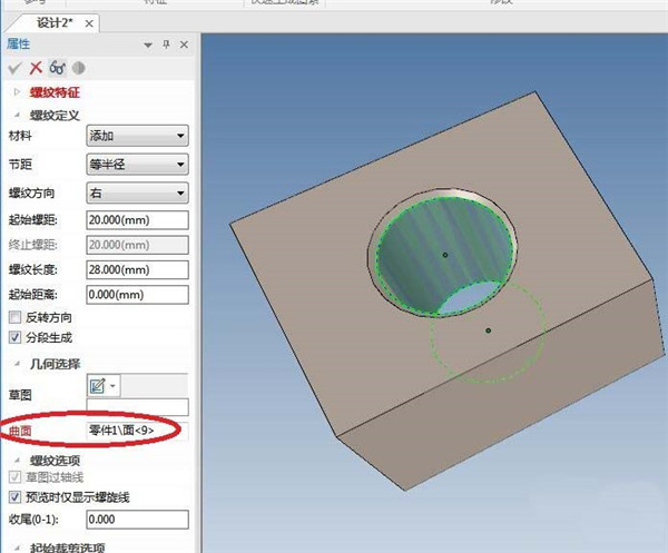5、软件右边属性栏中出现了“螺纹特征”,见红色框选,红色字体:曲面,我们选择孔类圆柱体的内侧曲面(见实体中的变色的曲面)。