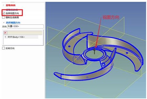 目前,"提取曲面 "工具只允许用户从零件中选择面,然后提取和创建曲面。在2021版本里将允许用户从场景中选择一个视图方向和主体或部件,并根据视图方向和主体/部件的投影计算出面,然后从这些面提取和创建曲面。