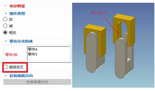 在“布尔交”的下面增加一个选项,名为“保留相交”,默认为勾选。当取消此选项时代表希望获取求交的逆结果。