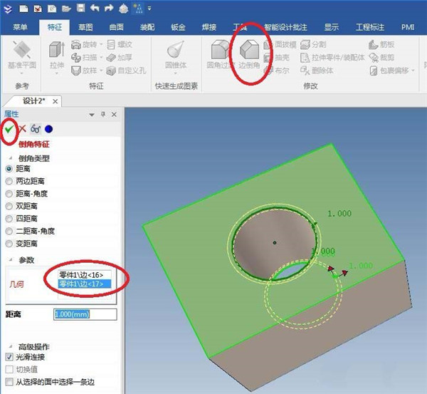 3、点击特征工具栏中的“边倒角”图标,属性栏设置距离为1,实体中选择孔的两头边线,“√”确定生成并退出。