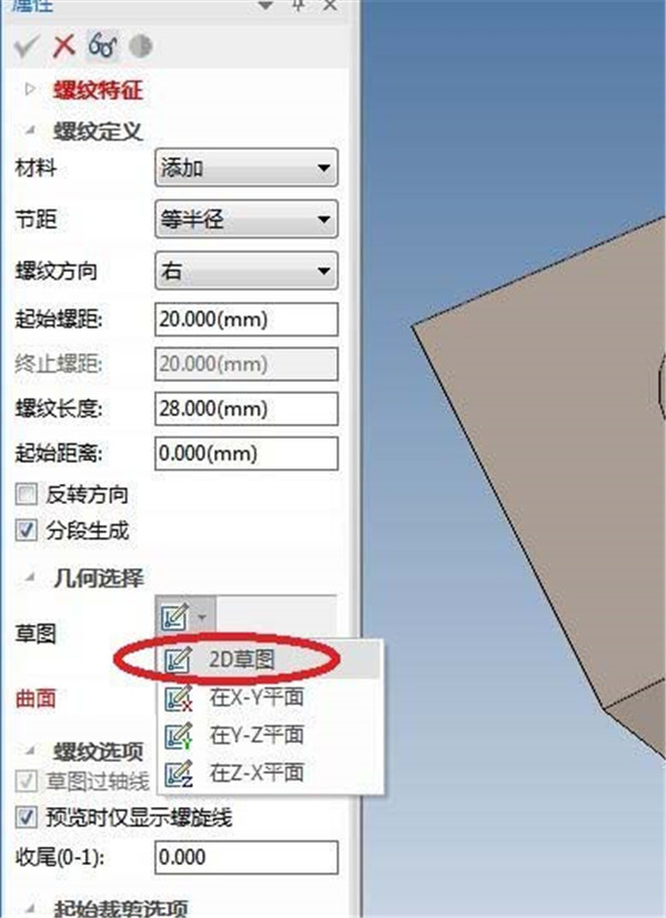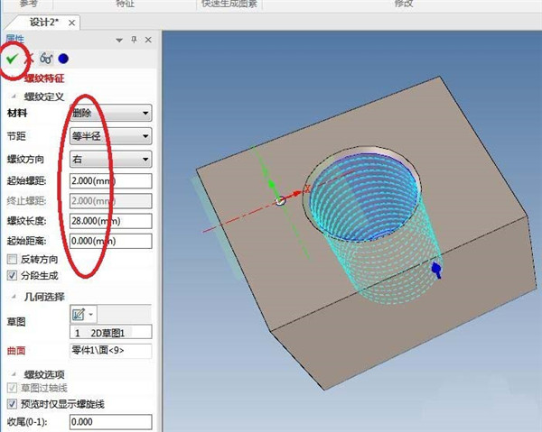 10、退出草图之后,在属性栏中设置螺纹特征的参数:材料改成“删除”,起始螺距:输入2,其余可以采用默认,点击“√”完成螺纹特征的创建。