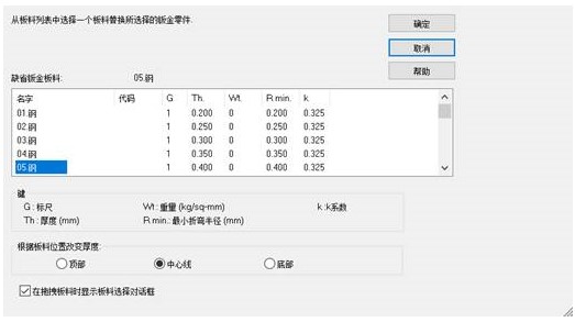 当第一次创建一个钣金零件时会自动弹出板料规格选择对话框。