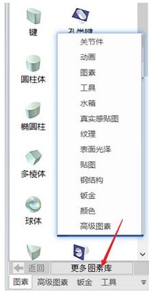 在图素库底部增加了“返回”和“更多”按钮。使用“返回”按钮可以在使用多级图素库时快速返回上级图素库;使用“更多”按钮显示其他的图素库。