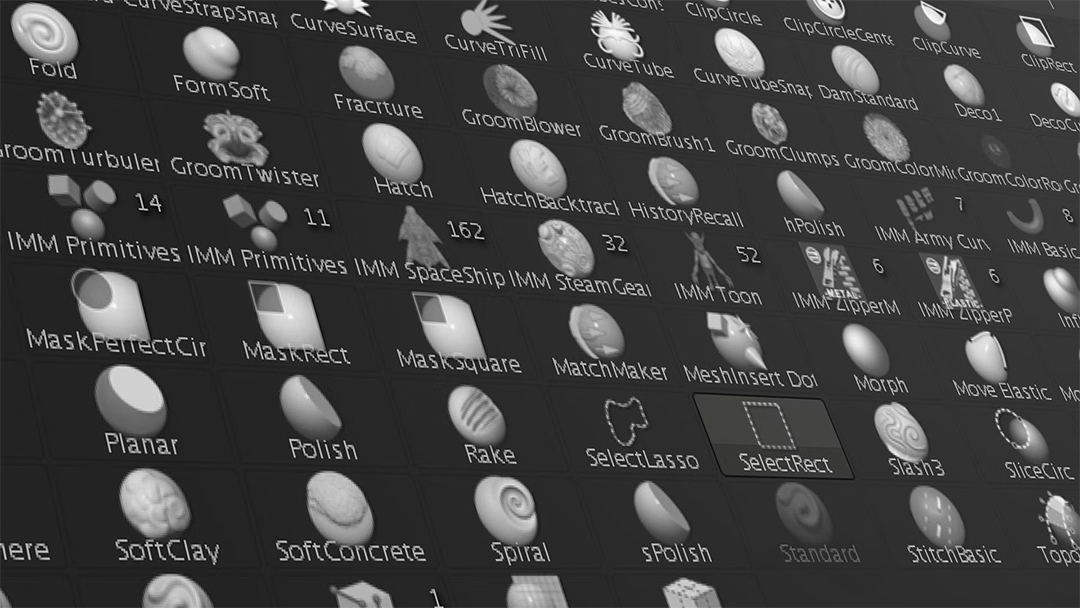 使用ZBrush创建的主要工作流程基于一个笔刷系统,该系统也可以使用来自绘图板的笔压感进行调制。ZBrush将再现真实笔刷或雕刻工具的自然感觉,使用施加在笔尖的压力以多种方式改变您的数字笔触。有刷子可以捏、移动、建立表面、凿入其中、切开模型等等。您甚至可以将其他3D模型用作笔刷,将它们的几何形状插入到您的表面中