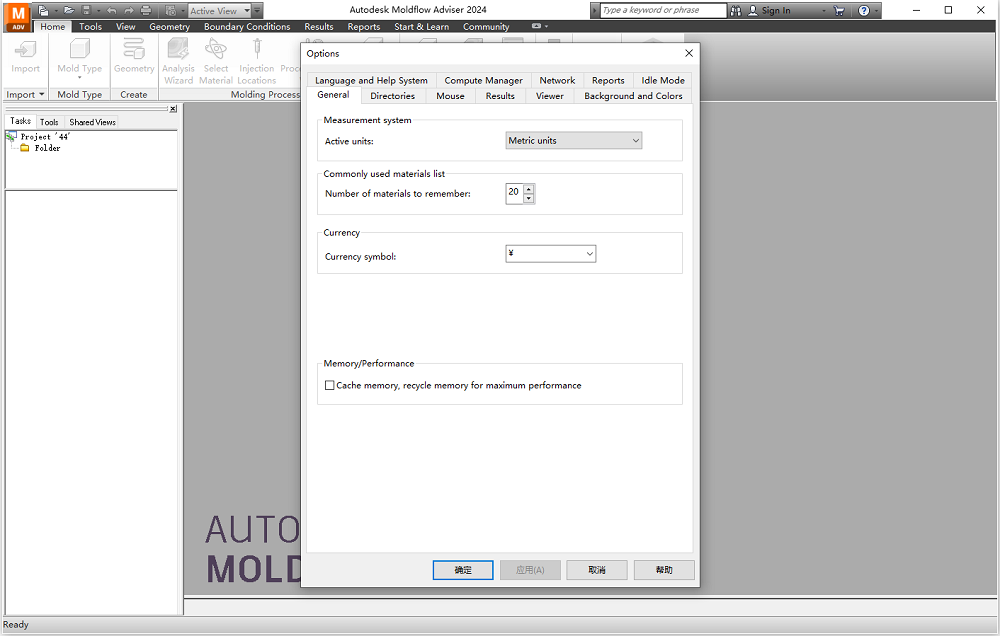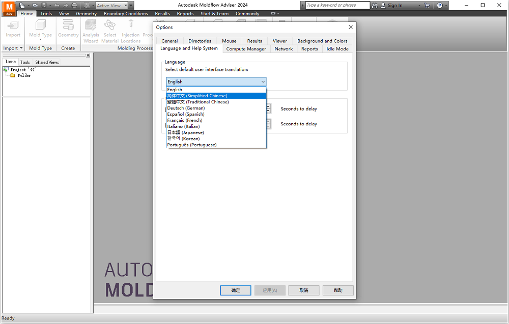 10、将Language切换为简体中文,切换完成后点击“确定”,然后重新打开软件,就将Autodesk Moldflow Adviser 2024设置成中文了。