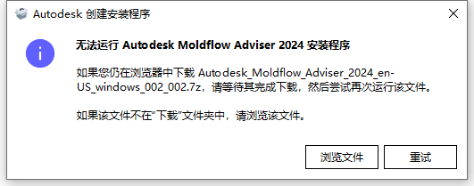 2、根据上图提示,点击“浏览文件”将位置指向Autodesk_Moldflow_Adviser_2024_en-US_windows_002_002.7z文件,完成后如下图所示: