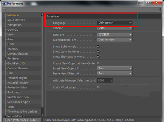 maxon cinema 4d r18默认语言为英文,我们需要手动进行设置。首先,确定安装中文语言包后,打开CINEMA 4D,然后通过CTRL+E键弹出设置界面,在Language中选择Chinese,然后重启软件即可。