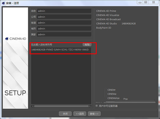 6、然后回到安装界面,将个人信息补全,将Cinema4D R18序列号复制入内