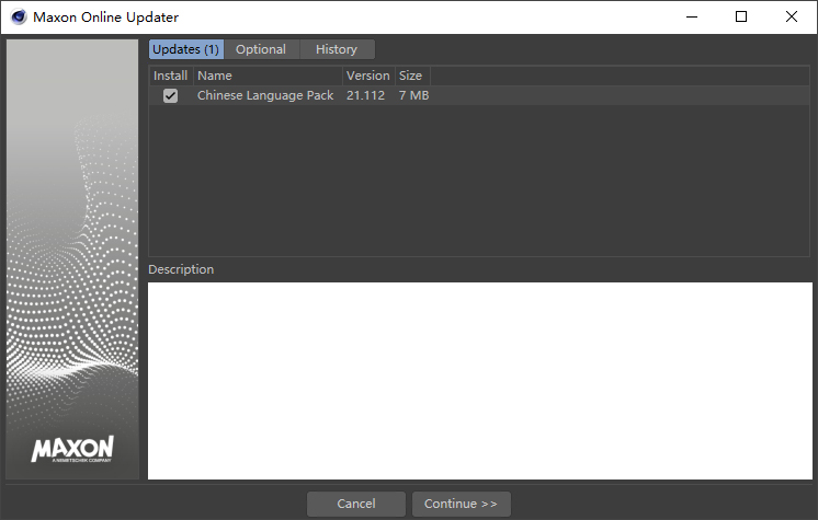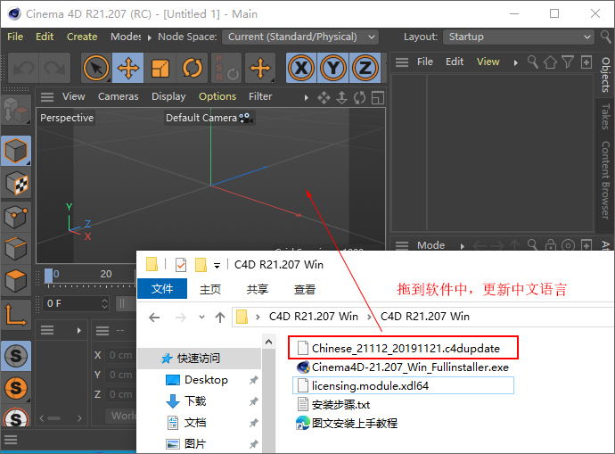 6、打开c4d r21软件,将Chinese_21112_20191121.c4dupdate拖到软件界面更新;