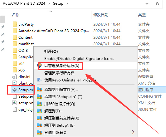 1、下载解压,得到autocad plant 3d 2024中文免费版,打开Setup文件夹,选择Setup.exe鼠标右键以管理员身份运行;