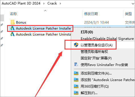 6、接下来激活操作,打开Crack文件夹,选择Autodesk License Patcher Installer.exe鼠标右键以管理员身份运行;