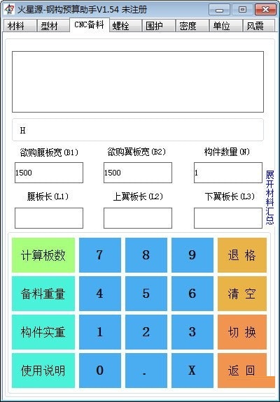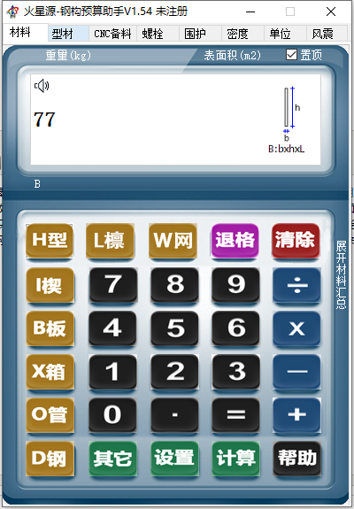 火星源钢构预算助手的界面设计简洁明了,类似于计算器的参数输入界面,让用户可以直观地看到各种参数的输入和输出。在材料选择方面,软件提供了多种类型的材料供用户选择,包括H型钢、I楔钢、B板钢、x箱钢、o管钢、D钢等。用户只需点击所需的材料类型,就可以立即显示出相应的图纸,同时,图纸上也会显示出对应的参数,方便用户查看当前计算的材料类型。