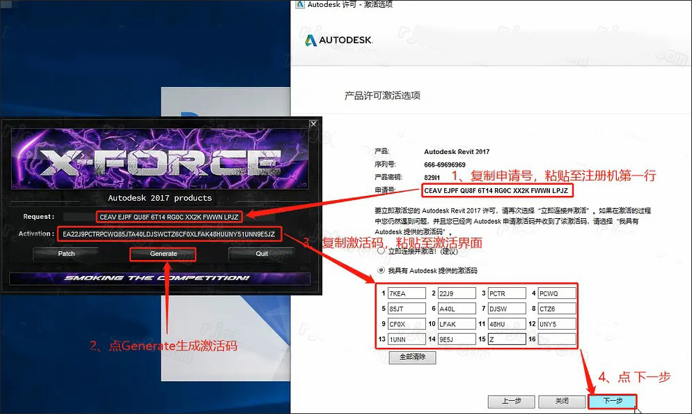 11、将“申请码”复制到注册机的第一项中,点击“Generate”,生成激活码