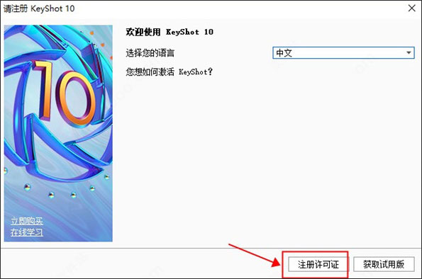 8、打开软件选择默认语言为中文,然后点击注册许可证;
