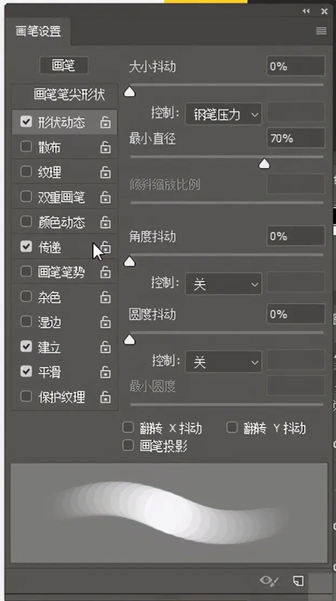 形状动态—最小直径,普通画笔是100%,19号是70%。数值越大,笔头越圆;数值越小,笔头越尖。