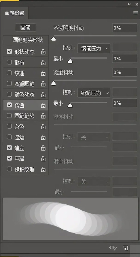 2、传递—控制画笔不透明度的变化,通过画笔压力,可以画出深浅不一的颜色,传递—流量抖动,可以有效的控制力度对颜色的把控。