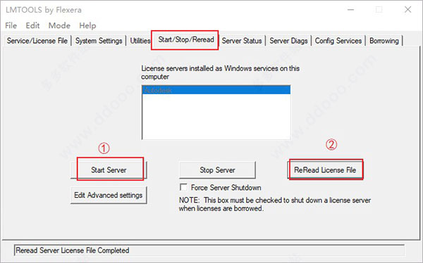 16、点击start/stop/read选项,点击'start server'启动服务,再点击 'rereadlicense file'。